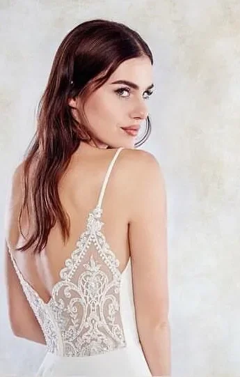This classic A-line silhouette flatters every figure, skimming your curves with a gentle grace and creating a timeless, effortlessly sophisticated look. Delicate spaghetti straps frame your shoulders and flow seamlessly into a stunning V-neckline, both elongating your silhouette and showcasing your décolletage with a touch of understated allure. For a touch of added comfort and support, a built-in bra ensures a flawless fit throughout your special day.