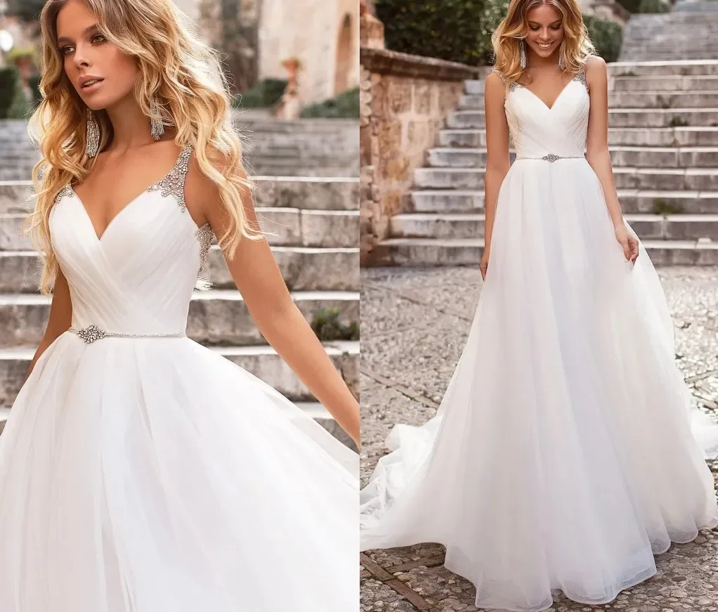 The Elegant V-neck Sleep Crystal Beaded A Line Wedding Dress is a stunning and luxurious choice for any bride-to-be. This classic style dress features a V-neckline and sleeveless design, creating a timeless and elegant look. The floor-length hem adds a touch of romance and sophistication, making it perfect for a beach or outdoor wedding. The backless design adds a touch of sensuality, while the crystal beaded detailing adds a touch of sparkle and glamour. This dress is made with high-quality materials and is fully customizable to ensure the perfect fit. With a natural waistline and A-line silhouette, this dress is sure to flatter any body type.