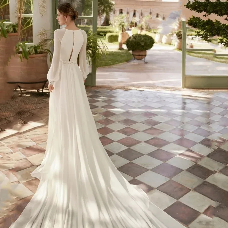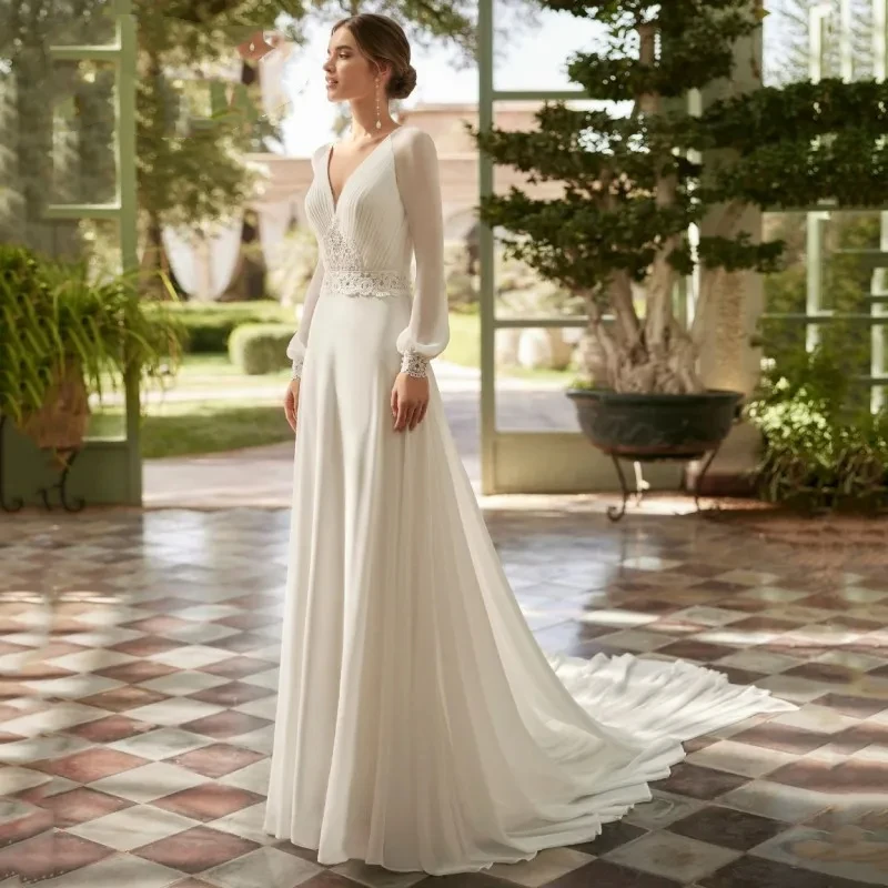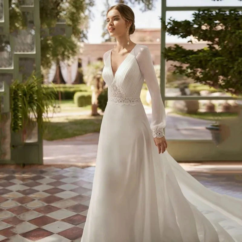 Elegant V-Neck Chiffon Long Sleeve A-Line Wedding Dress