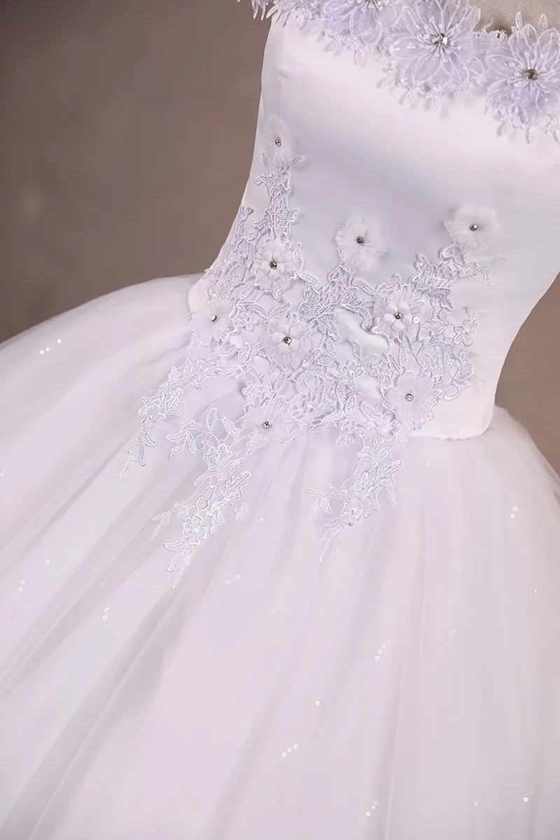 · Floral Fantasy: Delicate floral appliqués bloom across the bodice and skirt, adding a touch of whimsical charm. These blooms are meticulously crafted, some shimmering with sequins for a touch of subtle sparkle.
