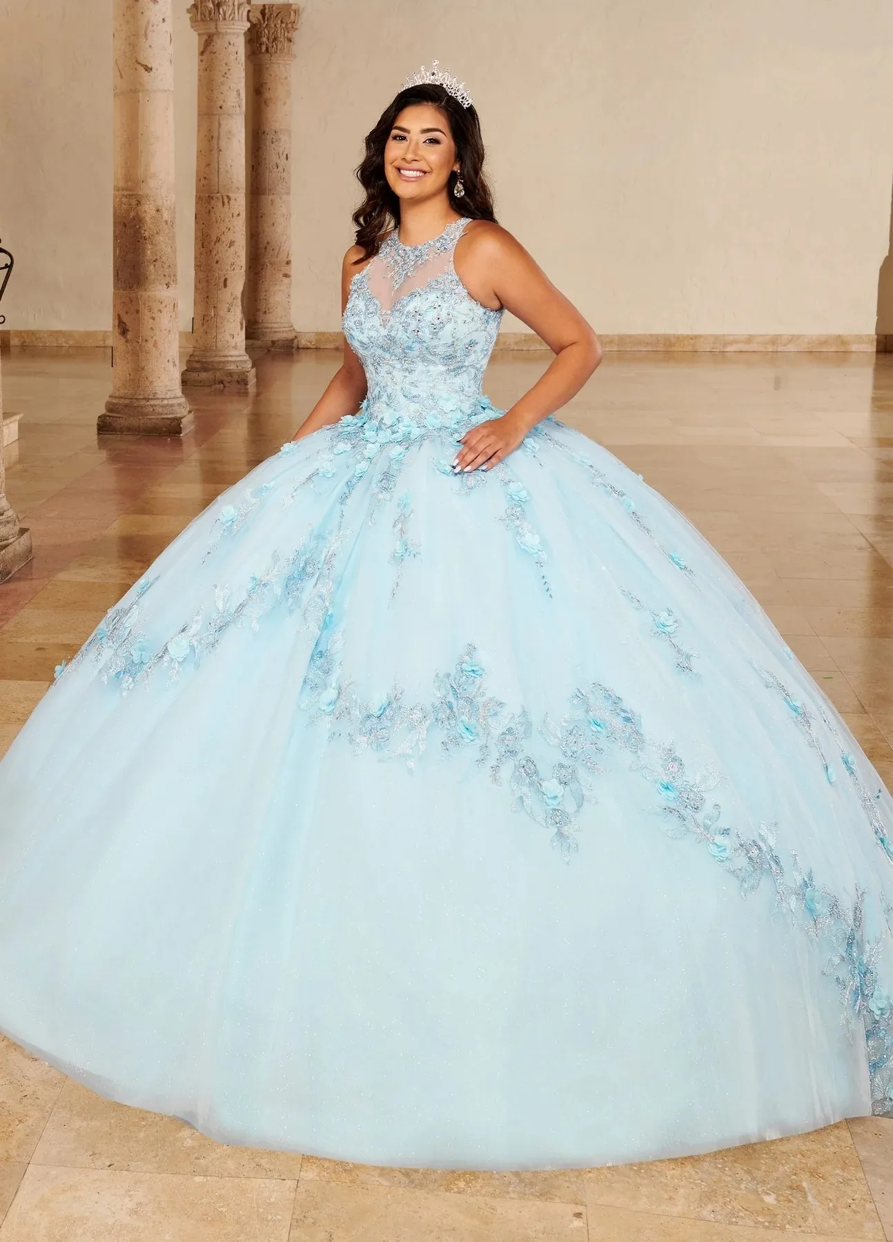 The dress is a symphony of textures and details. Its delicate tulle fabric creates a voluminous, ethereal silhouette that will make her feel like a princess. The halter neckline and sleeveless design showcase her graceful shoulders and arms, while the floor-length hem adds a touch of sophistication. The appliques adorning the dress are intricate and delicate, adding a touch of glamour and sparkle.