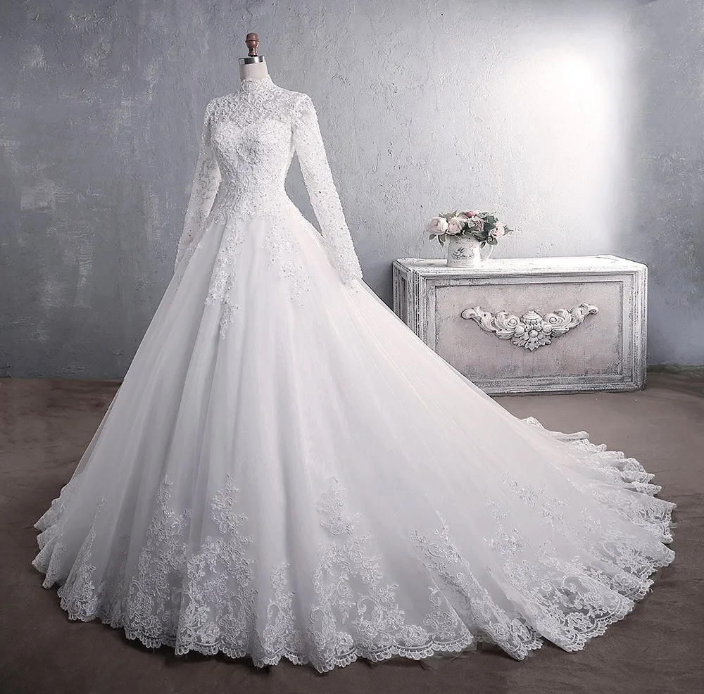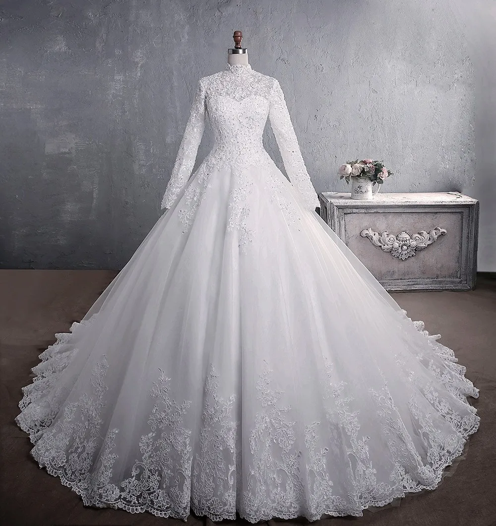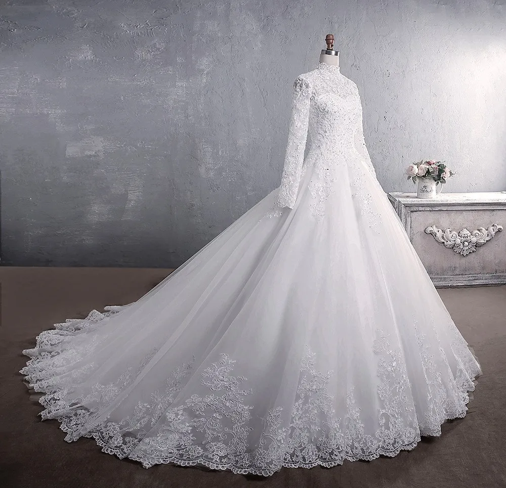 The dress boasts a classic style, perfect for the bride who desires a look of enduring elegance. The high neckline delivers a touch of regal charm, while the full sleeves, cascading gracefully to your wrists, add a touch of graceful modesty. The A-line silhouette flatters all body types, cinching at the princess waistline to beautifully define your curves before flowing gently into a romantic court train.