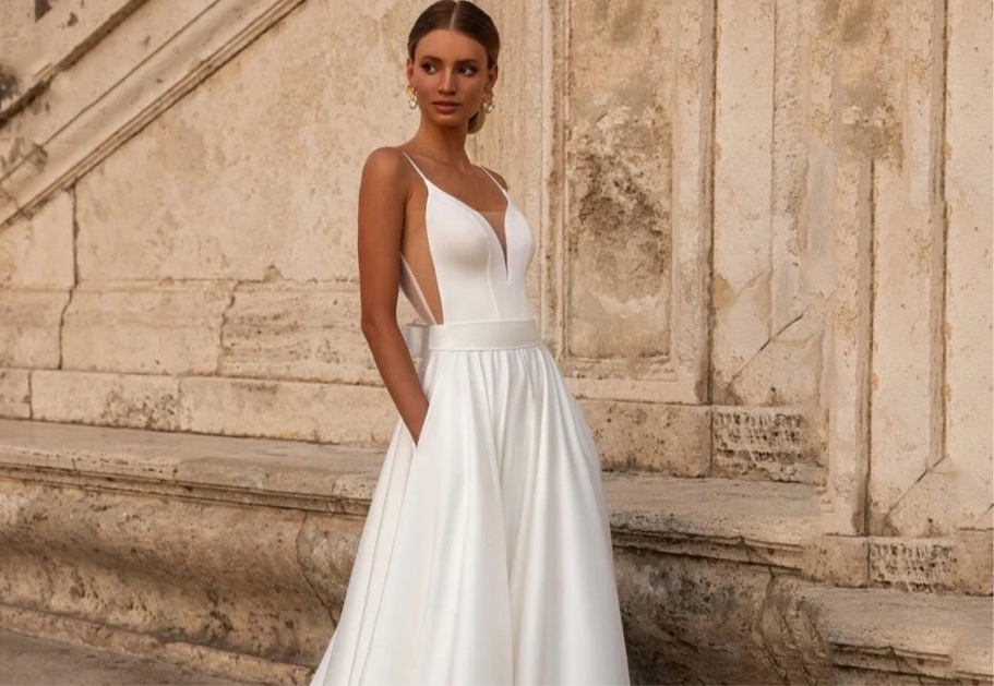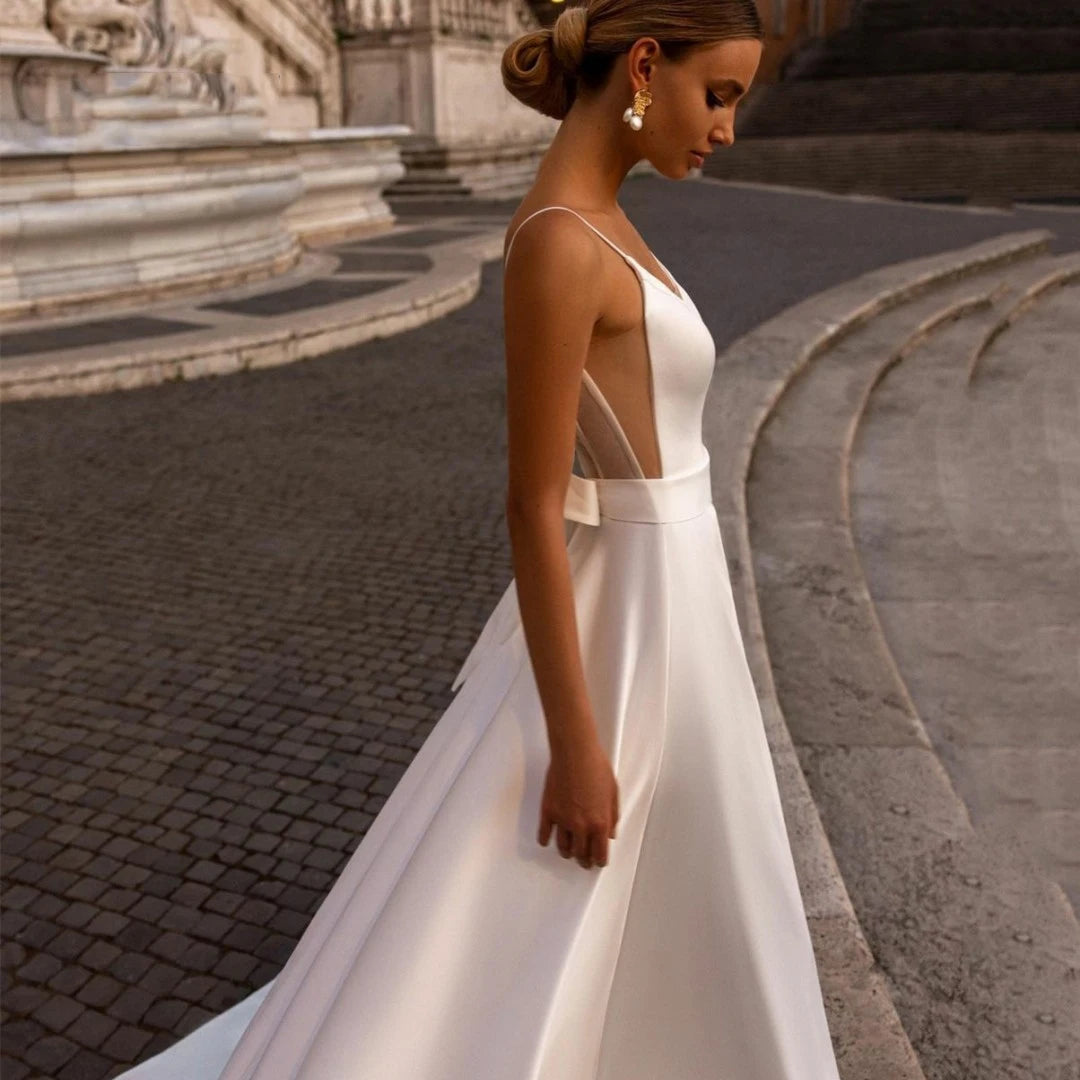 Is your dream wedding bathed in summer sunshine? Perhaps you simply desire a touch of modern minimalism. The sleeveless design of this dress caters to both. It showcases your shoulders and arms, allowing the cool air to caress your skin on a warm day. The clean lines and lack of sleeves allow the luxurious satin fabric to take center stage, creating a sleek and contemporary feel that perfectly complements a modern venue or outdoor ceremony.