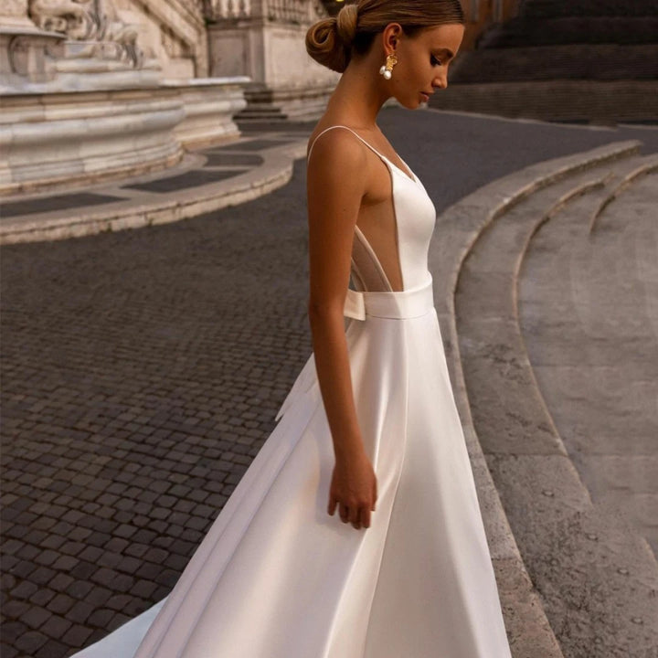 The plunging V-neckline dips to a point that flatters your décolletage and adds a touch of subtle sensuality, drawing the eye to your most beautiful features. But don't worry about unnecessary exposure. The carefully considered cut ensures support and comfort, achieved through a built-in bra that allows you to move with confidence throughout your wedding celebration, worry-free and ready to embrace every moment.